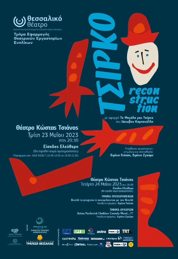 23 Μαΐου 20:30 Παράσταση: “Τσίρκο reconstruction” Τμήμα Εφαρμογής 24 Μαΐου 20:00 & 21:00Παρουσιάσεις τμημάτων Προχωρημένων / Αρχαρίων Θέατρο «Κώστας Τσιάνος»