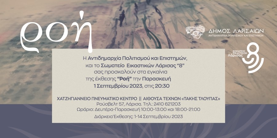 Η έκθεση με τίτλο «Ροή» πραγματοποιείται από το Σωματείο Εικαστικών Λάρισας «8» σε συνδιοργάνωση με την Αντιδημαρχία Πολιτισμού και Επιστημών