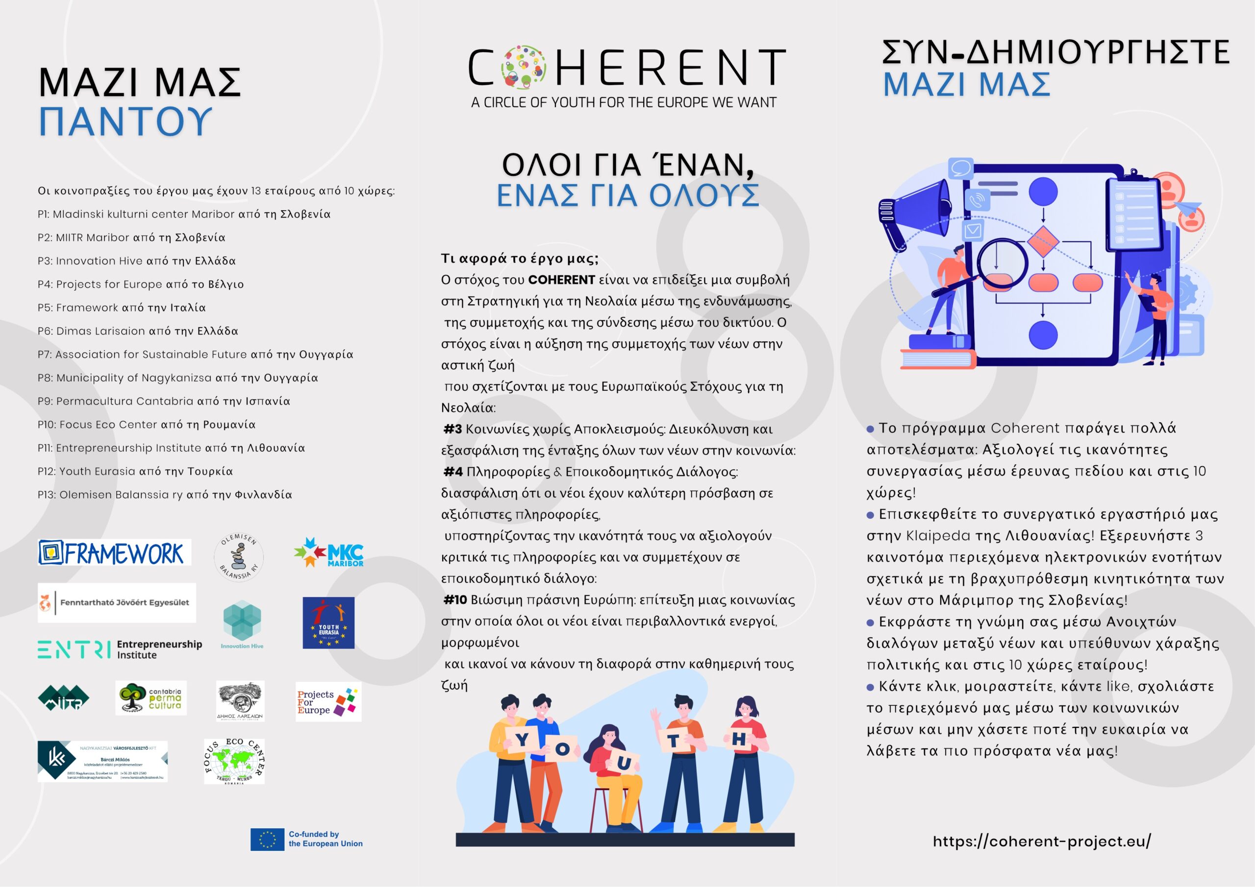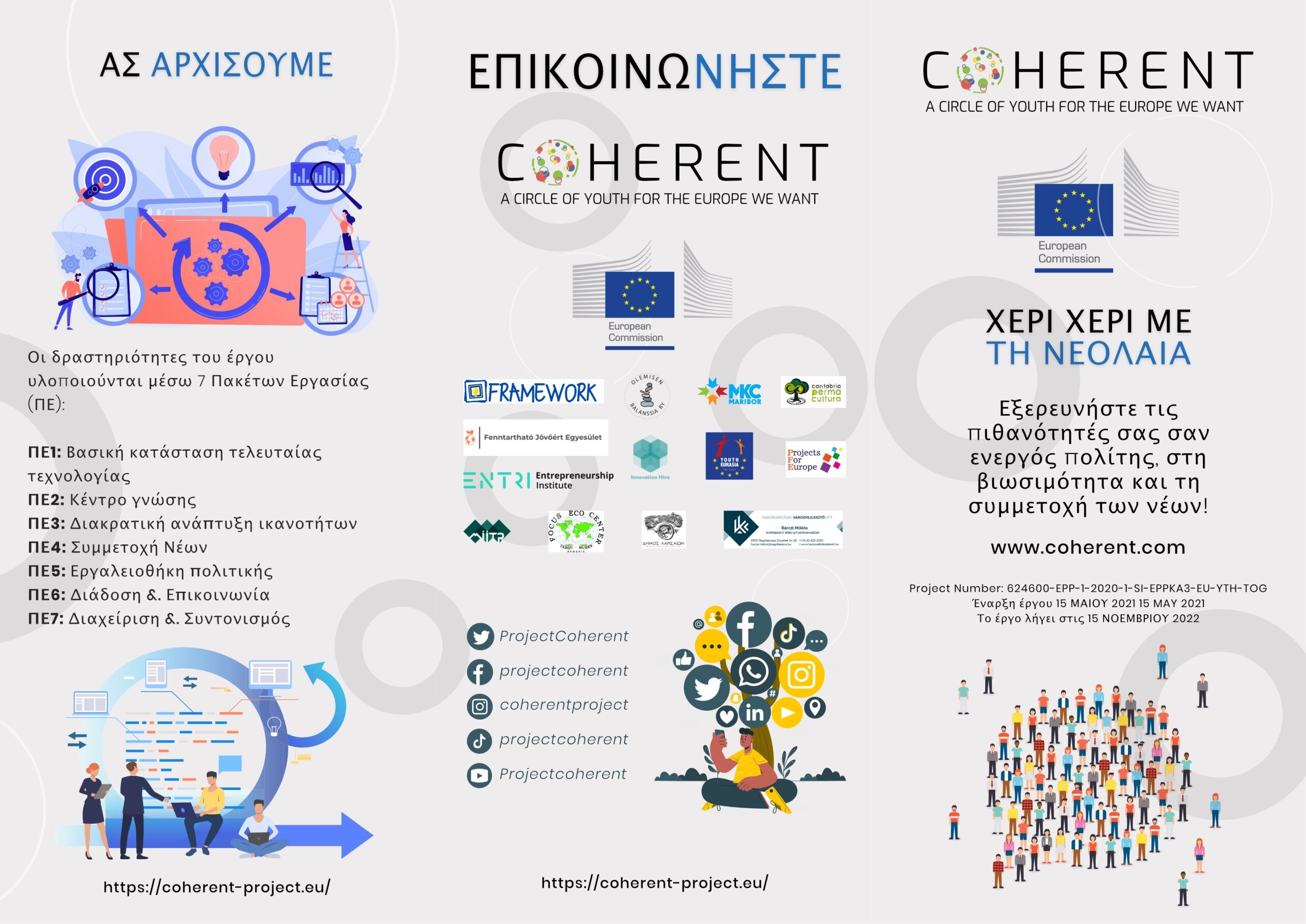 Στόχος του COHERENT είναι να συμβάλλει στη στρατηγική για τους νέους μέσω της ενδυνάμωσης, της εμπλοκής και της σύνδεσής τους μέσω του δικτύου. Ο στόχος είναι η αύξηση της συμμετοχής των νέων στη ζωή της πόλης, σε συσχετισμό με τους Ευρωπαϊκούς Στόχους για τη Νεολαία #3 (Κοινωνίες χωρίς αποκλεισμούς), #4 (Πληροφόρηση & εποικοδομητικός διάλογος), #10 (Βιώσιμη Πράσινη Ευρώπη), την προώθηση της διασυνοριακής κινητικότητας και την αύξηση της συνεργασίας των νέων σε έργα, συμπεριλαμβανομένης της ανάπτυξης ικανοτήτων. Στο πλαίσιο του COHERENT πρόκειται να υλοποιηθούν: κόμβος γνώσεων (3 ηλεκτρονικές ενότητες), ηλεκτρονικά βιβλία, δράσεις κινητικότητας, δημόσιες συζητήσεις, εργαλειοθήκη διαμόρφωσης πολιτικών κ.λπ.. Το COHERENT θα έχει βραχυπρόθεσμες και μακροπρόθεσμες επιπτώσεις στη νεολαία, τις ΜΚΟ, λοιπούς συμμετέχοντες, καθώς και σε κοινωνικοοικονομικά περιβάλλοντα, π.χ., απόκτηση νέων ικανοτήτων, δεξιοτήτων και νοοτροπίας σχετικά με τη βιώσιμη ΕΕ, τη δημοκρατία, τη συμμετοχή, την πολιτειότητα, την αύξηση των ομάδων στόχων που ενδιαφέρονται για συμμετοχή, αυξημένη συνεργασία.