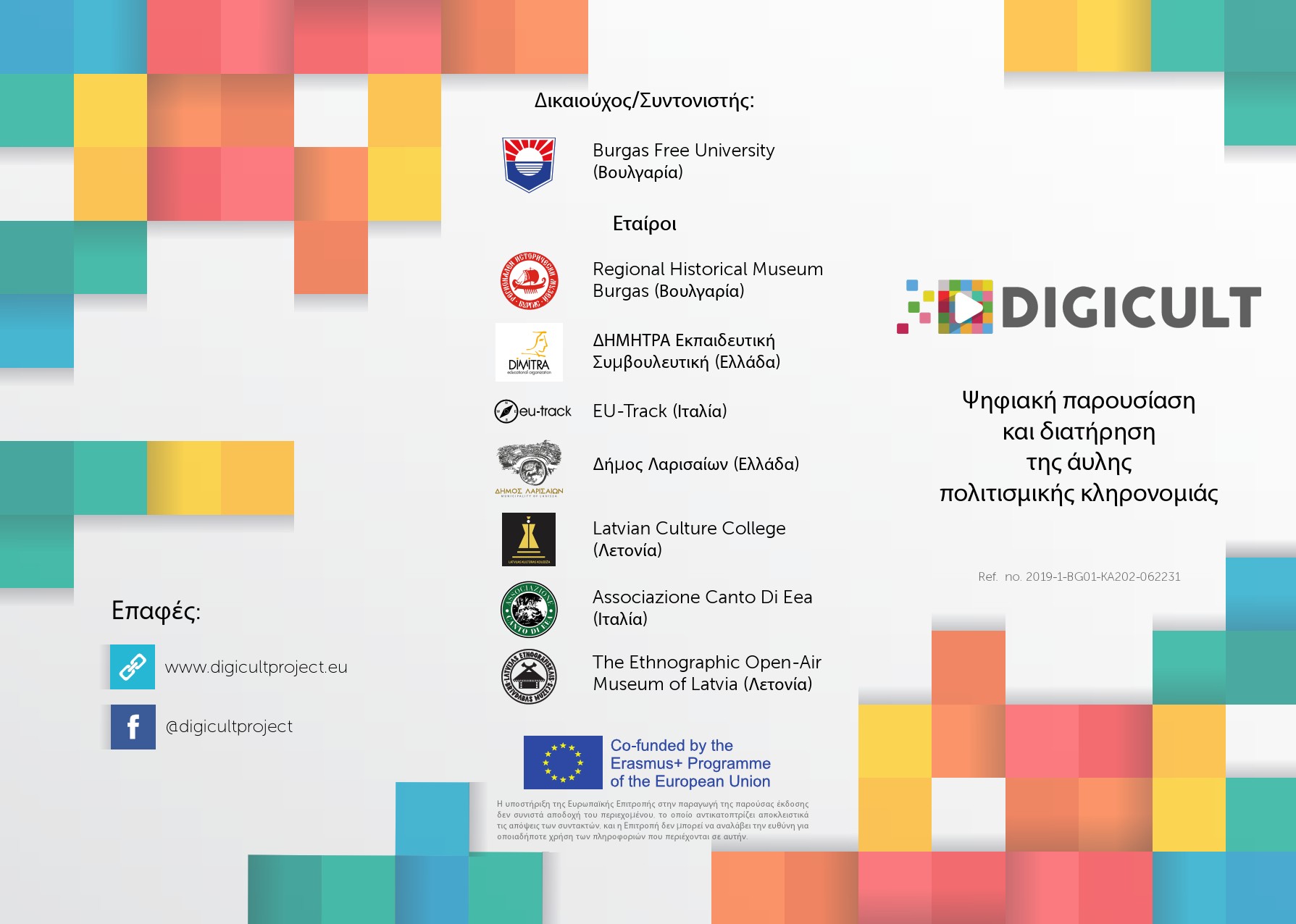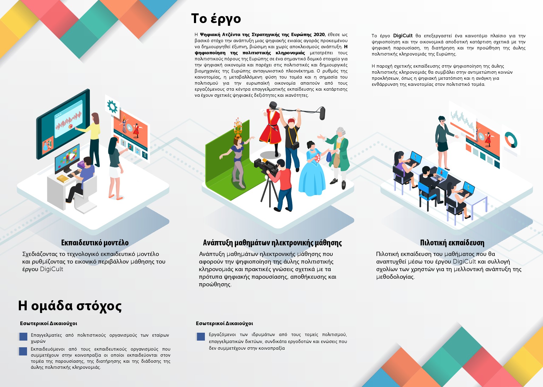 Στόχος του προγράμματος DigiCult είναι η δημιουργία και προώθηση ενός καινοτόμου πλαισίου ψηφιοποίησης και αποτελεσματικής και οικονομικά αποδοτικής εκπαίδευσης για την ψηφιακή παρουσίαση, τη διατήρηση και την προώθηση της άυλης πολιτιστικής κληρονομιάς (ICH) της Ευρώπης, μέσα από μια παγκόσμια και μακροπρόθεσμη προοπτική. Η παροχή σχετικής κατάρτισης στην ψηφιοποίηση ICH (πρότυπα και μέθοδοι) θα συμβάλει στην αντιμετώπιση κοινών προκλήσεων όπως η ψηφιακή μετάβαση και η ανάγκη ενθάρρυνσης της καινοτομίας στον πολιτιστικό τομέα, καθώς η ικανότητα πρακτικής εφαρμογής των ψηφιακών δεξιοτήτων και ικανοτήτων αποτελεί πολύτιμο πλεονέκτημα για οποιαδήποτε επαγγελματική πιστοποίηση σε αυτόν τον τομέα.