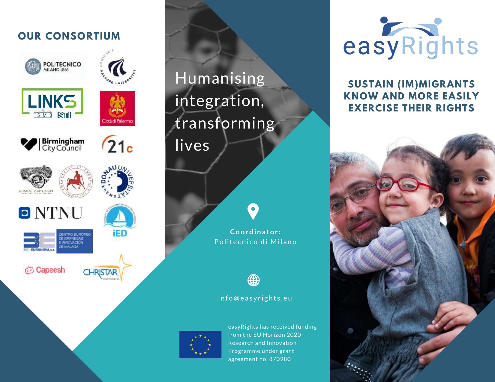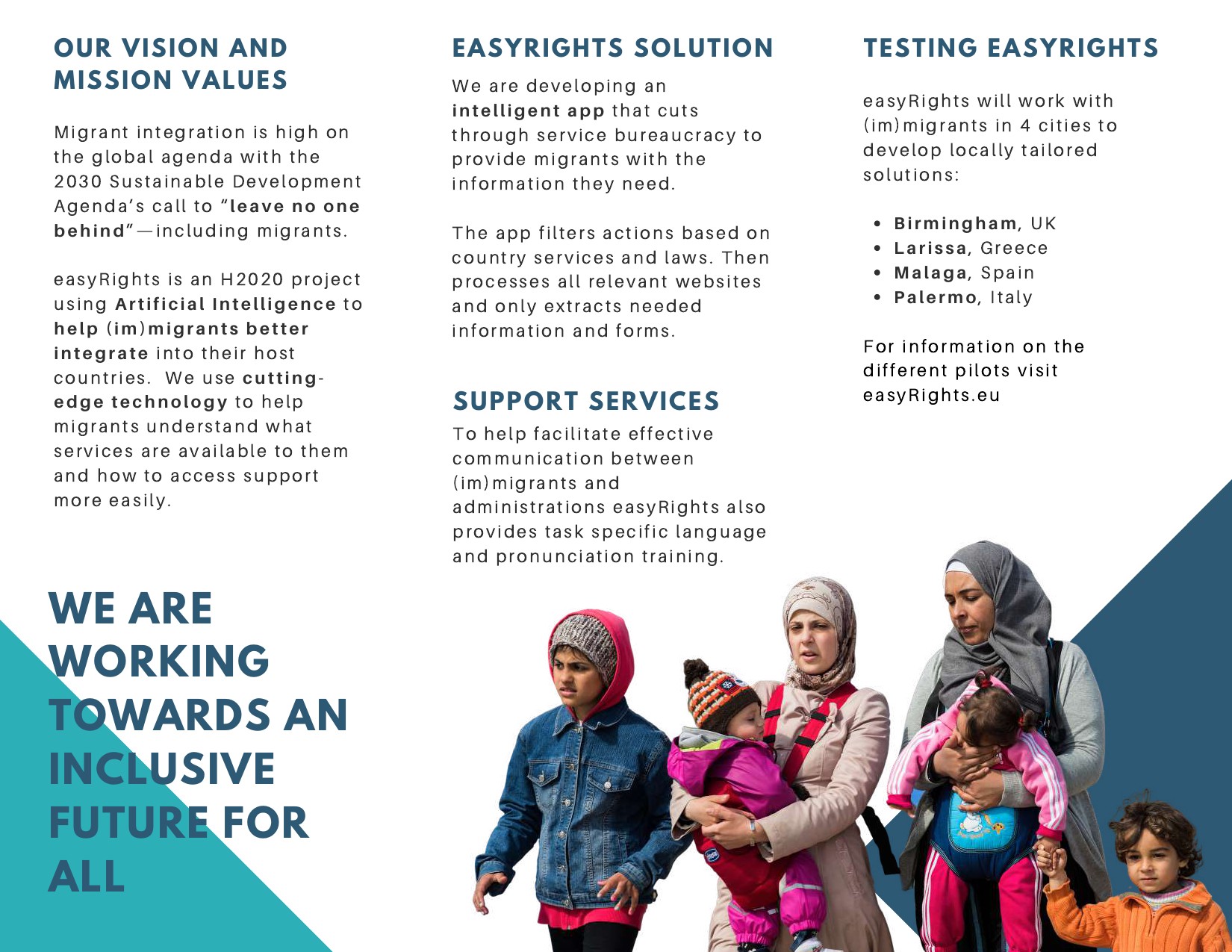 Ο πρωταρχικός στόχος του EASYRIGHTS είναι η ανάπτυξη ενός οικοσυστήματος που θα συν-δημιουργηθεί σε τοπικό επίπεδο, στο οποίο διάφοροι φορείς που ανήκουν στο τοπικό σύστημα διακυβέρνησης μπορούν να συνεργαστούν για την αύξηση της ποσότητας και της ποιότητας των δημόσιων (προνοιακών) υπηρεσιών που προσφέρονται στους μετανάστες. Οι ειδικότεροι στόχοι είναι να υπάρξει βελτίωση τόσο στο γενικό πλαίσιο όσο και στην εξατομίκευση των δικαιούχων, να ενισχυθούν οι μελλοντικοί δικαιούχοι των υφιστάμενων υπηρεσιών για καλύτερη πρόσβαση και ευκαιρίες και να συμμετάσχουν τα ενδιαφερόμενα μέρη σε κοινές και αποτελεσματικές προσπάθειες συν-δημιουργίας, διευκολυνόμενες από τη χρήση hackathons. Μια πλατφόρμα easyRights – με το διπλό ρόλο της “συγκέντρωσης των τοπικών φορέων” και της “συλλογής υπηρεσιών online και offline” – θα αναπτυχθεί σε τέσσερις πιλοτικές τοποθεσίες (Μπέρμιγχαμ, Λάρισα, Παλέρμο και Βαλένθια). Με αυτόν τον τρόπο, το πρόγραμμα easyRights μπορεί να υποστηρίξει τους μετανάστες στην αναζήτηση απαντήσεων σε διαφορετικές ανάγκες, καθιστώντας τους πιο αυτόνομους – τουλάχιστον σε κάποιο βαθμό – από τη γραφειοκρατία πρώτου επιπέδου, εξοικονομώντας χρόνο τόσο για μετανάστες όσο και για προσωπικό κοινωνικών υπηρεσιών και μειώνοντας το κόστος για τη δημόσια διοίκηση.