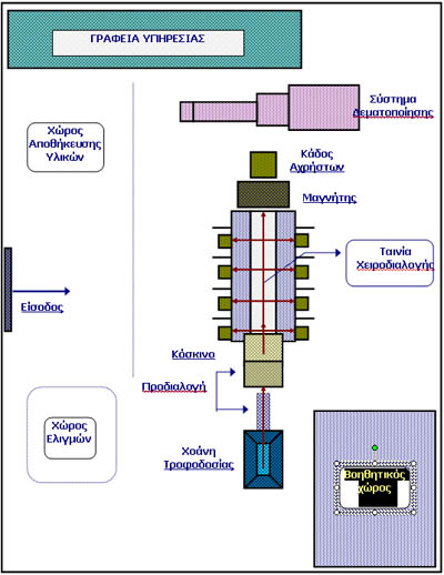 •  Για την υποδοχή του όγκου των προσκομιζόμενων υλικών – στις περιπτώσεις που η χωρητικότητα της χοάνης δεν επαρκεί – στο κτίριο προβλέπεται χώρος υποδοχής όπου τα υλικά μπορούν να παραμένουν προσωρινά μέχρι την προώθησή τους για διαχωρισμό.