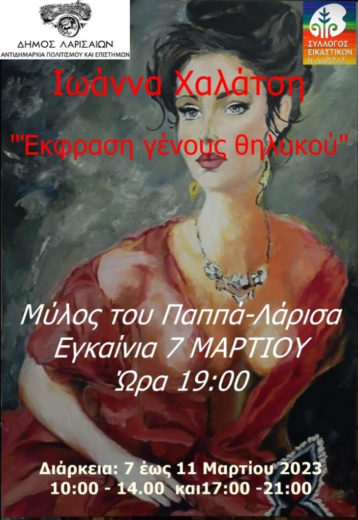 Έκθεσης ζωγραφικής με τίτλο: “Έκφραση γένους θηλυκού”, της Ιωάννας Χαλάτση, θα πραγματοποιηθεί την Τρίτη 7 Μαρτίου 2023 και ώρα 19:00, στον εκθεσιακό χώρο του Μύλου του Παππά Λάρισας, σε συνεργασία με την Αντιδημαρχία Πολιτισμού και Επιστημών Δήμου Λαρισαίων και τον Σύλλογο Εικαστικών Ν. Λάρισας.