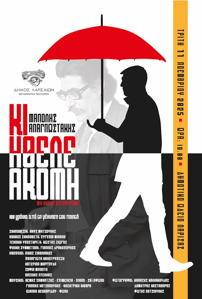 Θεατρική παράσταση – αφιέρωμα στον σπουδαίο ποιητή της μεταπολεμικής γενιάς, Μανόλη Αναγνωστάκη, με τίτλο “Μανόλης Αναγνωστάκης κι ήθελε ακόμη”, διοργανώνει η Αντιδημαρχία Πολιτισμού του Δήμου Λαρισαίων, με αφορμή τη συμπλήρωση 100 χρόνων από τη γέννησή του, την Τρίτη 11 Νοεμβρίου 2025 και ώρα 19.00 στο Δημοτικό Ωδείο Λάρισας.