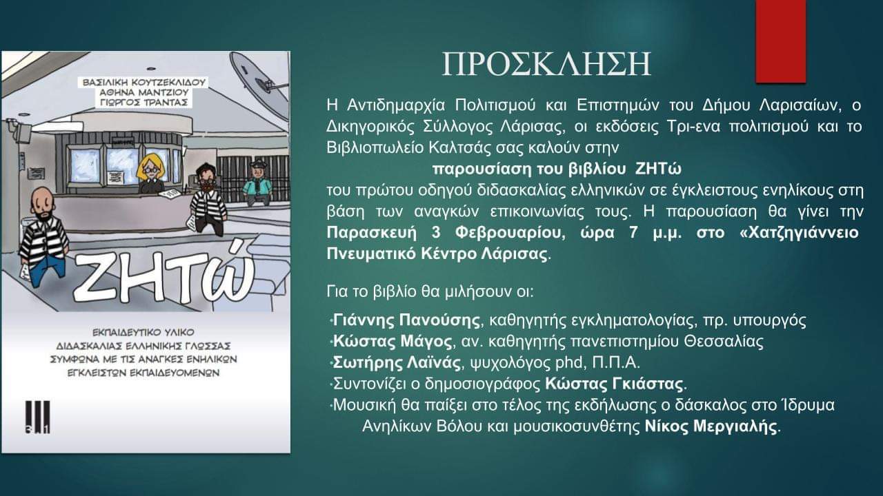 Η πρώτη παρουσίαση του βιβλίου “Ζητώ”, του πρώτου οδηγού εκμάθησης ελληνικών σε ενήλικους έγκλειστους στη βάση των επικοινωνιακών αναγκών τους. θα γίνει στη Λάρισα, στο Χατζηγιάννειο Δημοτικό Πνευματικό Κέντρο, την Παρασκευή 3 Φεβρουαρίου 2023 στις 19:00, με ομιλητές τους πανεπιστημιακούς Γιάννη Πανούση και Κώστα Μάγο καθώς και τον δρ. ψυχολογίας Σωτήρη Λαϊνά.